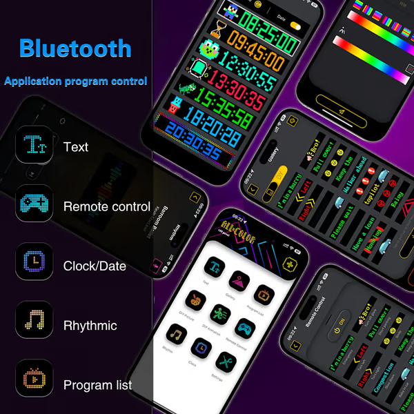 Okostelefonos vezérlés:;A dedikált mobilalkalmazás segítségével könnyedén vezérelheti a puha képernyőt. Válasszon a különböző szemminták közül, vagy készítsen saját DIY-terveket és szöveganimációkat, hogy kifejezze egyedi stílusát.
