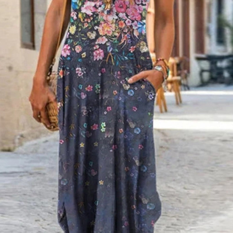 Virágmintás, hosszú szabású ruha: Bájos, teljes felületet borító virágmintával és hosszú szabással, amely mozgás közben kecsesen hullámzik, ötvözve az eleganciát a laza kényelemmel.