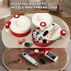 FORGÓ MÁGNESES KIALAKÍTÁS – Az innovatív mágneses szerkezet biztonságosan tartja a tűket. Egy egyszerű nyomással egyetlen tűt lehet kivenni, így megelőzhető a véletlen szúrás, és biztonságosabbá és könnyebbé válik a varróeszközök megtalálása és elővétele.