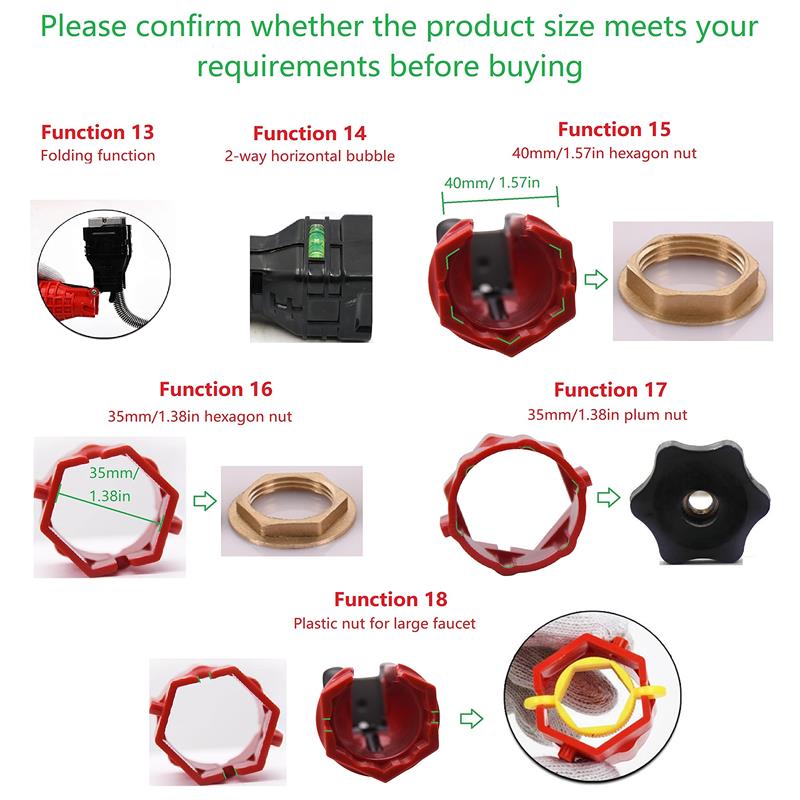 Az összecsukható kialakítás megkönnyíti a nehezen elérhető szerelőanyák elforgatását a csaptelepeken, permetezőkön és gömbcsapokon. Csak rögzítse a pozíciót, és gyorsan forgassa el, majd cserélje ki a csaptelepre szerelt anyát.