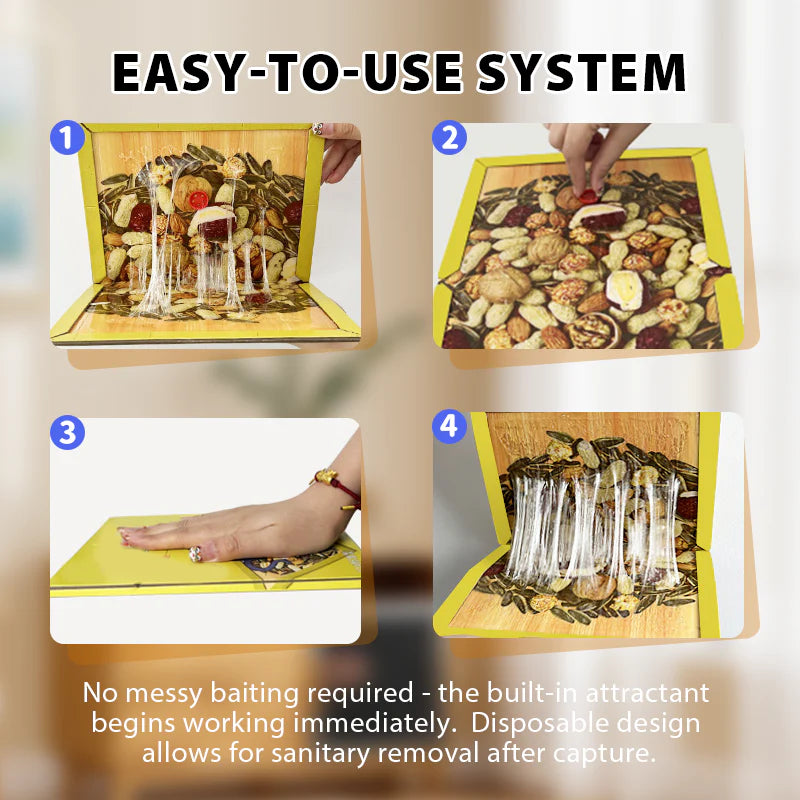 KIVÁLÓ RAGASZTÓERŐ: Ipari erősségű ragasztóval rendelkezik, amely előre felvitt csalogatóanyaggal hatékonyan vonzza az egereket. Az ultra-ragadós felület biztosítja az azonnali befogást érintkezéskor, megakadályozva a szökést. Minden általános háztartási rágcsálóra hatékony, mérgek és vegyszerek nélkül.