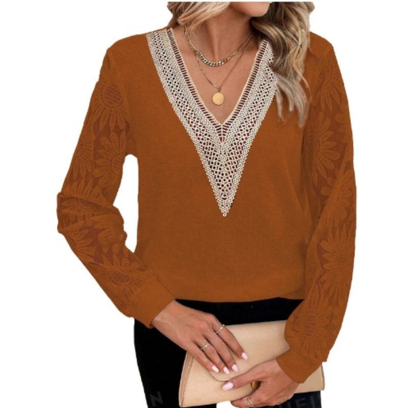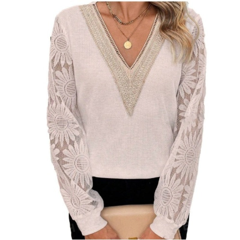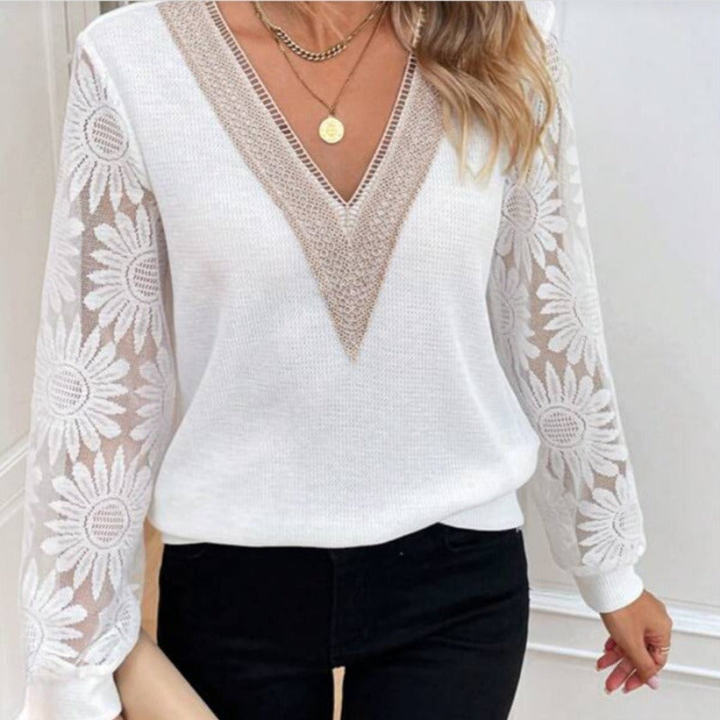 1× Elegáns Virágos Csipkés Ujjú V-Nyakú Felső